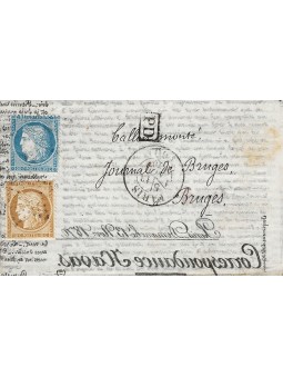 Siège de Paris 20 centimes bleu et 10 centimes bistre, oblitérés par l'étoile, sur une Agence Havas édition Française à destination de Bruges. Au recto, le cachet à date de Paris le 13 nov 70 et d'arrivée au verso le 26. Rare composition. Certificat.