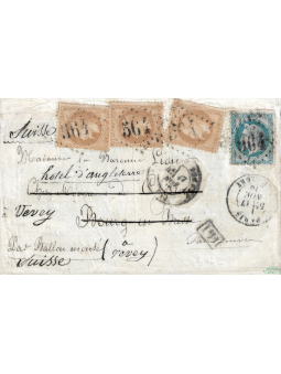 Empire Lauré 20 centimes bleu, oblitéré légère et 10 centimes bistre 3 unités, tous oblitérés gros chiffres au départ de Bourg en Bresse, sur une lettre réexpédiée en Suisse et donc réaffranchie avec 3 timbres de 10 centimes alors qu'un seul aurait suffi. Au recto, le cachet à date de Paris le 17 nov 70 et de départ de Bourg en Bresse le même jour. Au verso, les cachets d'arrivée en Suisse. Timbres avec léger défaut. Exceptionnelle composition. Signé avec certificat.