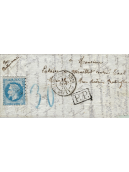Empire Lauré 20 centimes bleu, oblitéré par l'étoile pleine, sur une lettre à destination de Lyon. Au recto, le cachet à date de type 17 avec section de levée intermédiaire, le 4 novembre 70, n°1 de la 5ème levée. Signé Brun.
