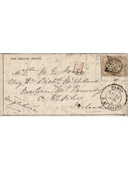 20 centimes bleu du siège oblitéré par l'étoile sur lettre avec correspondance pour St James. Au recto, le cad de Paris 29 nov 1870. Au verso, le rare cachet du bureau de passe du 2 dec et le cachet d'arrivée.
