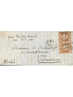 Emission du siège 10 centimes bistre, paire oblitéré par l'étoile 17 sur lettre à destination de Valenciennes. Au recto, le cachet à date de Paris rue du Pont Neuf le 2 décembre 1870. Au verso, le cachet d'arrivée à Valenciennes le 11 décembre 70. Signé Roumet. Certificat.