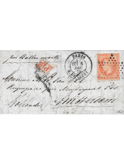 Empire Lauré 40 centimes orange, oblitéré étoile 24 sur lettre avec correspondance à destination d'Amsterdam. Au recto, le pd de Paris rue de Clery déc 70. Au verso, la marque hollandaire D85. Superbe. Signé Roumet. Certificat.