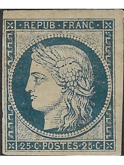 25 centimes bleu neuf avec trois grandes marges, voisins, léger pelurage en bas à droite. Signé CALVES.