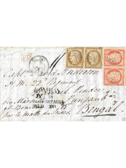 10 centimes bistre, paire avec une exceptionnelle nuance verdâtre foncée, oblitéré (un angle touché) et 40 centimes paire orange vif, quatre grandes marges dont les voisins du dessus oblitérés PC 2388, sur une superbe lettre avec correspondance à destination des Indes. Au recto, le cachet à date type 15 de Pau, et le cachet de passage à Bombay. Lettre de référence figurant dans le catalogue MAURY - CERES - DALLAY 2009. Superbe signée ROUMET avec certificat.