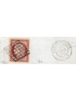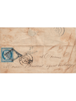 25 centimes bleu de très belle qualité, oblitéré par un losange (Grille de Viella) de fabrication locale, sur une lettre légèrement incomplète avec correspondance à destination de Auch. Au recto, la cursive 31 Viella et le cachet à date de type 15 de Riscle le 16 octobre 1851. Au verso, le cachet d'arrivée le 17 octobre 1871. Probablement unique. Certificat BEHR. Ex collection FRANCOIS.