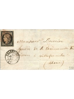 20 centimes noir, avec quatre très belles marges, oblitéré par la grille rouge, deux belles frappes d'une superbe couleur foncée sur une lettre à destination de Villefranche. Au recto, le cachet à date de Valencienne le 19 janvier 1849. Très rare oblitération. Cote : 20000€. Plusieurs signatures dont CALVES. Lettre de qualité exceptionnelle. Certificat BOULE.