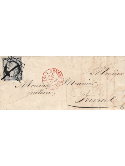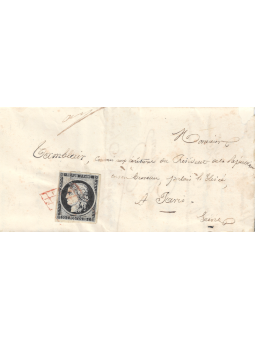 20 centimes noir intense, avec quatre très belles marges (infime défaut en partie supérieure en un point) oblitéré par la grille rouge, belle frappe d'une superbe couleur sur une lettre avec correspondance. Le timbre n'a pas été annulé au départ, et à l'arrivée à Paris la lettre est passée par le bureau de contrôle. Très rare oblitération; Cote : 20000€. Lettre de très belle présentation. Signée CALVES.