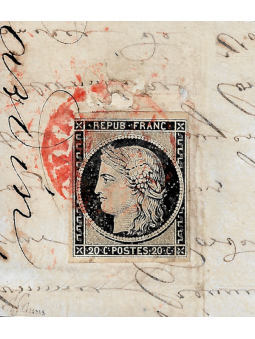 20 centimes noir, avec un léger défaut de marge, oblitéré par le cachet à date rouge du bureau central de Paris sur fragment de lettre. Très rare. Signé BRUN.