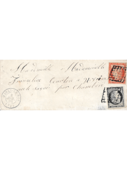 20 centimes , très belle nuance au filet à droite, et 40 centimes orange vif très beau, oblitérés par la grille sur une enveloppe de Marly le Roi, à destination de la Savoie, Etats Sardes. Au recto, le cachet à date du 8 juillet 1850. Au verso, les cachets de passage à Paris et d'arrivée. Exceptionnelle. Signée avec certificat.
