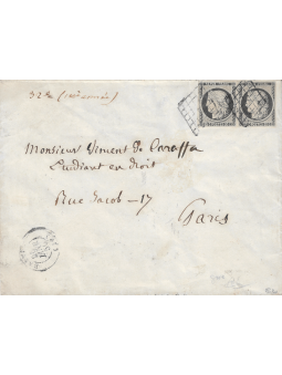 20 centimes, magnifique et très rare nuance gris (dit gris souris) en paire sur lettre envoyée en double port de Bastia à destination de Paris. Au recto, le cachet à date de Bastia le 25 janvier 1850. Cote : 8500€. Exceptionnelle paire sur lettre. Signée CALVES. Certificat Roger CALVES.