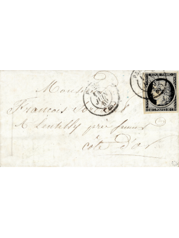 20 centimes noir, magnifique et très rare nuance noir intense sur fauve, sur une lettre avec correspondance de Paris à destination de Bordeaux. Au recto, le cachet à date de Paris le 2 mai 1850 et au verso le cachet d'arrivée. Exceptionnelle. Signée CALVES avec certificat.
