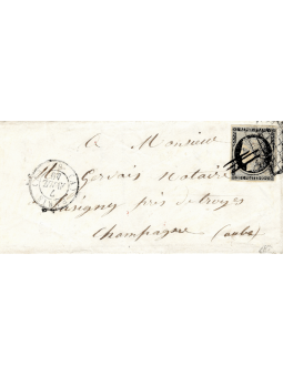 20 centimes noir intense de très belle qualité avec voisin du dessous, oblitéré par la grille et par un trait de plume sur une lettre avec correspondance à destination de la Provins. Au recto, le cachet à date rouge type 15 du bureau central de Paris le 29 janvier 1849. Superbe lettre. Rare composition. Signée ROUMET avec certificat.