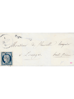 25 centimes bleu foncé de très belle qualité, oblitéré par un losange petits chiffres 1827 sur une lettre à destination de Limoges. Au recto, le cachet de type dateur A du 1er octobre 1851, la cursive de Magnac Bourg et OR en rouge. Très rare composition avec le n°4. Signée BAUDOT.