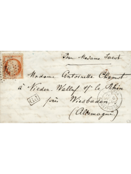 40 centimes orange du siège, oblitéré étoile 15, sur lettre avec correspondance pour le Grand Duché de Hesse. Au recto, le cad de Paris du 6 janvier 1871 7ème levée. Très rare destination en Allemagne. Cote : 4450 €. Superbe, signé Roumet.