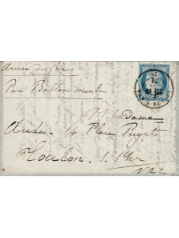 20 centimes bleu siège, sur lettre de l'Armée de Paris Fort de Nogent, du 5 janvier 1871 pour Toulon évoquant un moyen de correspondre par le "Time". La lette confiée aux aérostiers et le timbre a été annulé le 19 janvier 1871.Première pièce vue avec oblitération de Toulon. Signée Roumet avec certificat.