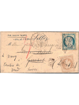 Siège 20 centimes bleu oblitéré étoile, sur lettre avec correspondance à destination de Guerrey puis réexpédiée. Au recto, le cachet à date de Paris le 19 janvier 71. Au verso, le cachet d'arrivée à Guerrey le 31 janv les cachets de passage en Suisse le 2 fév et d'arrivée le 14. A l'arrivée à Guerrey, un timbre empiré lauré de 10 centimes à été ajouté pour 30 centimes, tarif pour la Suisse. Le timbre a été annulé par le losange gros chiffres 1733 et la lettre a été réexpédiée et taxée à 3 centiles en Suisse. Superbe, signé Roumet avec certificat.