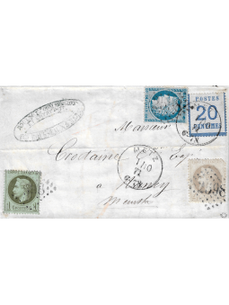20 centimes bleu de l'émission dite d'Alsace Lorraine, oblitéré par le cachet allemand cercle de Metz le 1/10/71 pour l'affranchissement en zone occupée et Cérès 20 centimes bleu, émission du siège + empire lauré 4 centimes gris (1 angle touché)et 1 centimes olive, oblitérés losange gros chiffres 2598 pour l'affranchissement coté zone libre. Lettre avec correspondance de Metz à destination de Nancy. Superbe et rare composition. Signée Roumet avec certificat.