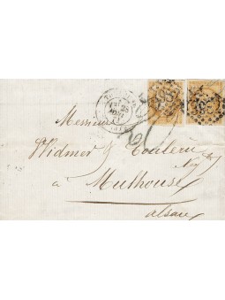 Emission de Bordeaux, 10 centimes bistre type A, deux unités dont (timbre de gauche marge courte à gauche)oblitérés par le losange gros chiffres 3982 sur lettre de Toulouse à destination de Mulhouse. La lettre a donc été taxée à 20 centimes pour la zone occupée. Très belle et très rare composition.
