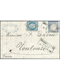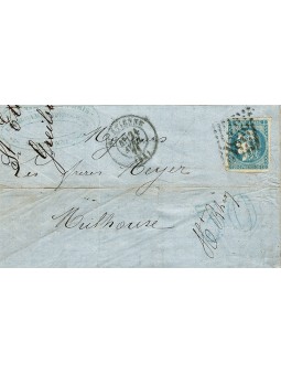 Emission de Bordeaux 20 centimes bleu n°46 par le losange gros chiffres 3581, sur une lettre avec correspondance de Saint Etienne à destination de Mulhouse. Au recto, le cachet à date de St Etienne le 31 avril 71 et la taxe au tampon bleu à 30 centimes. Au verso, le cad d'arrivée. Rare et belle composition.