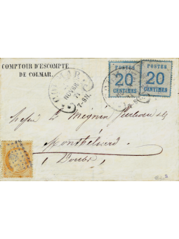 20 centimes bleu deux unités, oblitérés par le cachet allemand fer à cheval de Colmar le 27 novembre 71 et 40 centimes Empire siège orange, oblitéré par le losange 420 sur une lettre avec correspondance en double port du double affranchissement à destination de Monthélimar. Au verso, le cachet à date d'arrivée. Superbe. Signée Calves. Certificat.