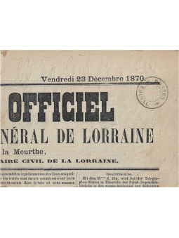 Journal officiel Général de Lorraine et de la Meurthe du vendredi 23 décembre 1871. Exemplaire entier en parfait état. Imprimé en français et allemand. Au recto, le très rare cachet provisoire d'Epinal double cercle de grand format sans dateur. Superbe exemplaire avec un cachet très rare, pièce d'amateur.