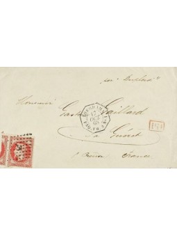 Empire lauré 80 centimes rose, un timbre +1/4 oblitérés losange encre sur enveloppe de Yokohama à destination du Guéret. Au recto, le très rare cachet de Yokoham Paq FR n°1 du 17/10/1868. Au recto, les cachets de passage et d'arrivée. Magnifique rare composition. Certificat.