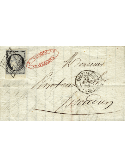20 centimes noir avec quatre très belles marges, oblitéré par la grille rouge, deux belles frappes d'une superbe couleur foncée sur, une lettre à destination de Villefranche. Au recto, le cachet à date de Valenciennes le 19 janvier 1849. Très rare oblitération. Cote : 20 000 €. Plusieurs signatures dont Calves. Lettre de qualité exceptionnelle. Certificat BOULE.