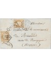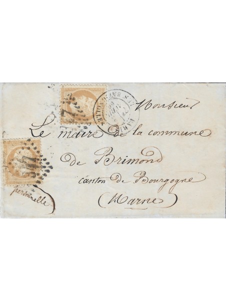 Empire dentelé à 10 centimes bistre brun, deux unités oblitérés losange gros chiffres 347 sur une lettre de Paris à destination de la Marne. Au recto, le cachet à date de Paris les Batignolles le 3/04/1866. Superbe.