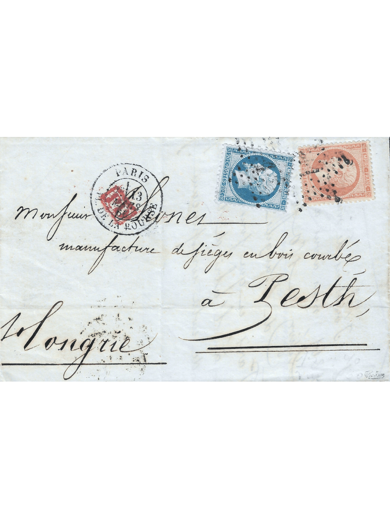 Empire dentelé 20 centimes bleu et 40 centimes orange tous deux de belle qualité oblitérés étoile 1 de Paris sur lettre avec correspondance à destination de Pest en Hongrie par la voie Autrichienne. Au recto le cachet à date de Paris place de la bourse le 13 mars 86. Très belle composition. Signée Calves. Certificat.