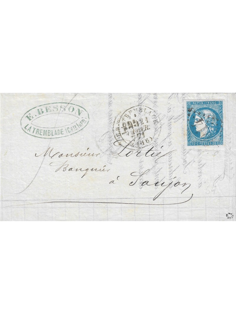 20 centimes bleu type 1 de qualité exceptionnelle avec petit bas de feuille, oblitéré par le losange gros chiffre 4014 sur une lettre à destination de Saujon. Au recto, le cachet à date de la Tremblade le 21/02/71. Superbe, signée ROUMET avec certificat.