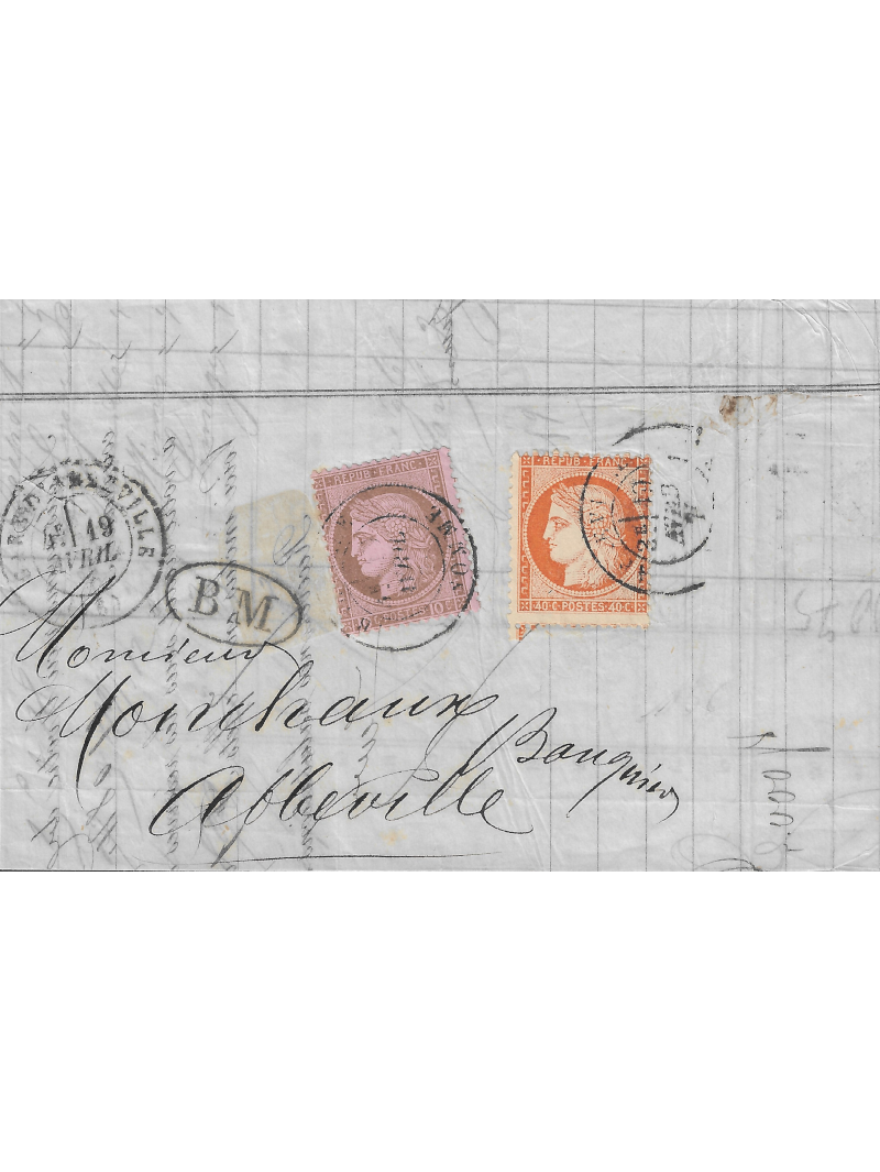 40 centimes orange et 10 centimes gros chiffres brun sur rose (3ème république) oblitérés à l'arrivée par le cachet à date type 18 d'Abbeville dans la somme sur lettre avec correspondance. Au recto, le cachet de boite mobile BM. Très belle et rare composition.