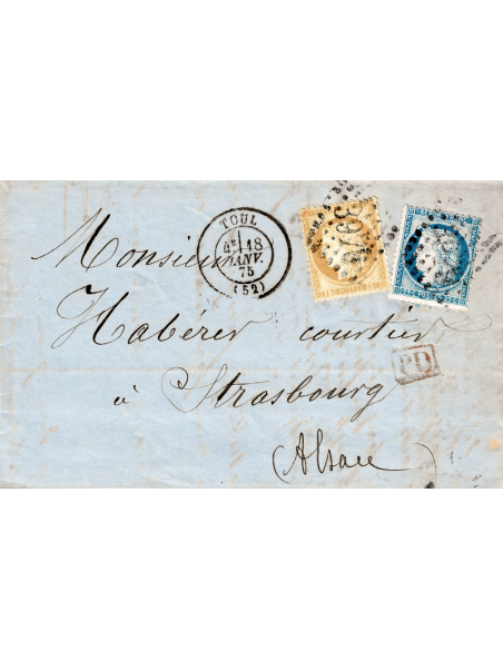 15 centimes bistre jaune n°55 et 25 centimes bleu, oblitérés gros chiffres sur lettre à destination de Strasbourg en Allemagne (territoires annexés) au recto le cachet à date de Toul le 18/01/75 et PD en rouge. Lettre superbe.