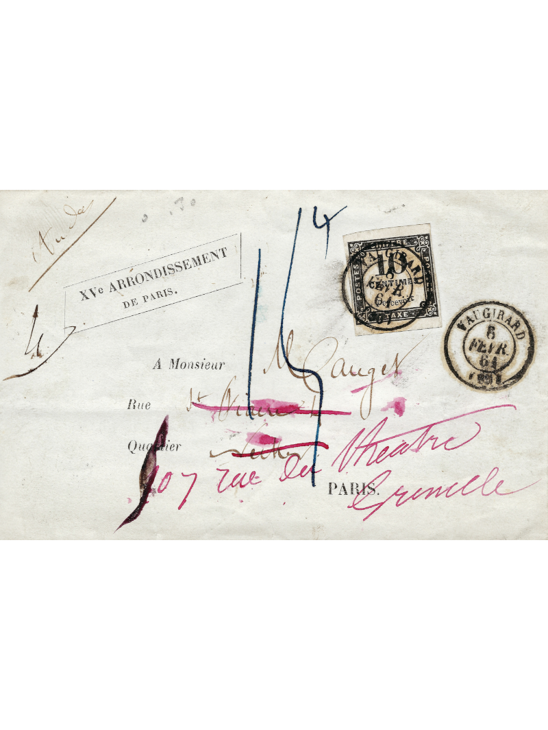10 centimes noir, n°1 type IIA oblitéré par le cachet à date de type 15 de Vaugirard sur lettre en port local, réexpédié donc taxée à 15 centimes. Superbe.