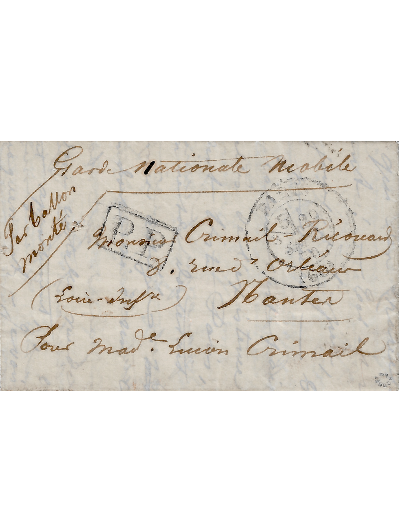 Lettre avec correspondance envoyée en port payé PP (franchise pour garde mobile) à destination de Nantes. Au recto, le cad de Paris le 29/09/70. Au verso, le cachet à date d'arrivée à Nantes le 16/10/70. Très belle composition. Signé ROUMET.