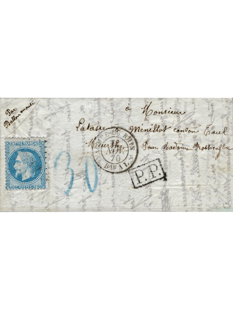Empire lauré 20 centimes bleu, oblitéré losange AR 13°C sur lettre avec correspondance à destination de TOUL, en zone occupée. Au recto, le cachet de l'Armée du Rhin BAU AL du 12/11/70 PP et la taxe allemande. Cote 6450 €. Signé, ROUMET et certificat.
