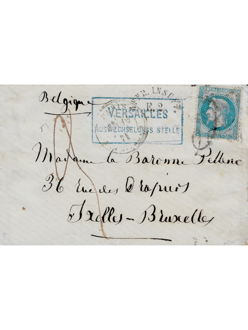 Empire lauré 20 centimes bleu oblitéré étoile (très légère) et taxe sur lettre taxée à destination de Bruxelles (tarif à 30 centimes). Au recto, le cachet à date de Paris le 10/02/71 et au recto également la marque rectangulaire bleue de la censure allemande de Versailles (premier jour d'utilisation) ainsi que la marque AFFR INSUF E2. Lettre superbe et très rare composition.