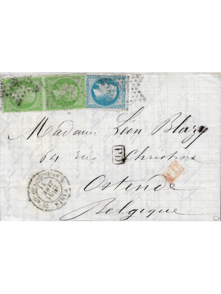 Empire dentelé 5 centimes vert paire et empire lauré 20 centimes bleu, oblitérés étoile sur lettre de Paris à destination d'Ostende de Belgique. Au recto, le cachet à date du 31/01/71. Magnifique correspondance faisant état de l'ouverture des lettres par la censure prussienne. Superbe, signée Roumet avec certificat.