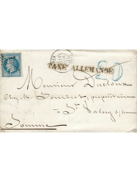 Empire lauré 20 centimes bleu oblitéré étoile une correspondance HAVAS à destination du Progrès de Lyon. Au recto, le cachet de Paris le 30/01/71, deux jours après la fin du siège. Au verso, le cachet d'arrivée le 12/02/71 ( passée par la censure à Versailles). Première pièce vue en bleu sur papier épais ayant voyagé. Signé ROUMET avec certificat.