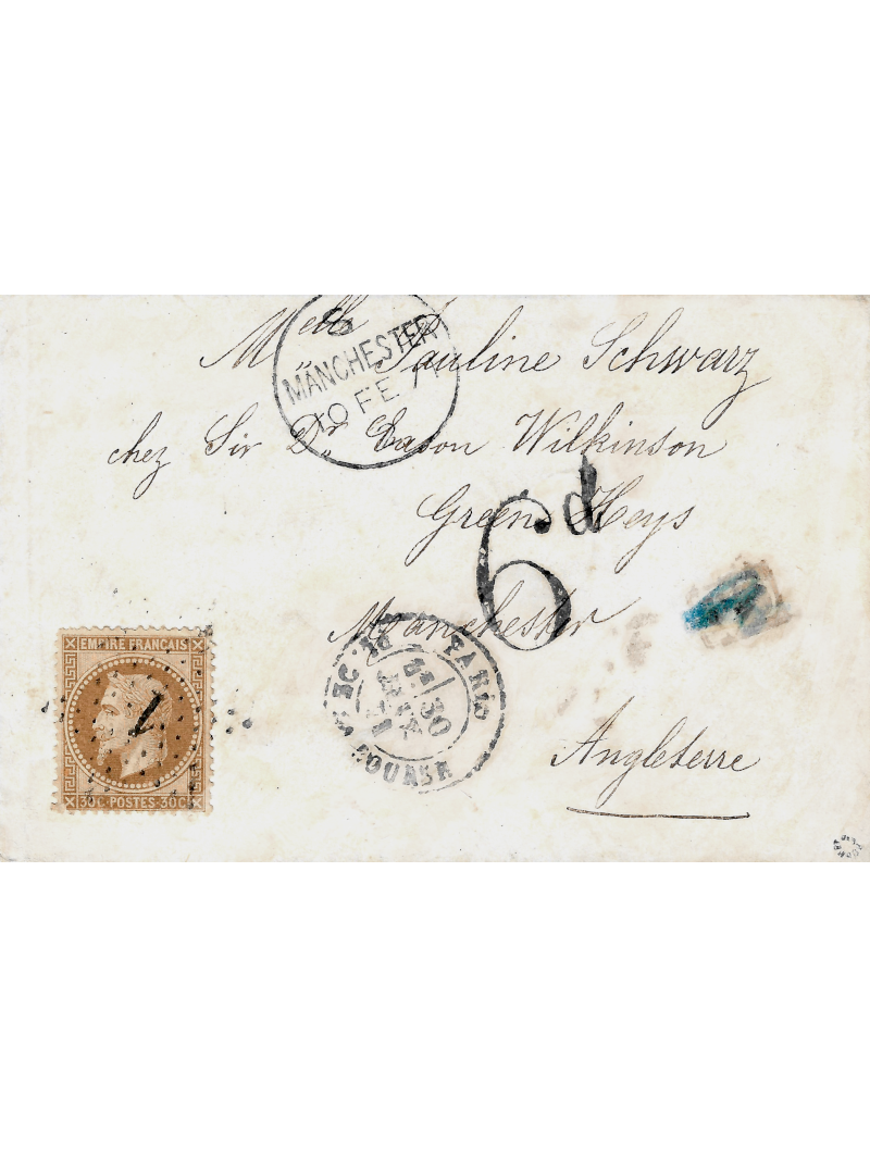 Empire lauré 30 centimes brun oblitéré étoile 1 sur une enveloppe à destination de Manchester. Au recto, les cachets à date de Paris le 30/01/71 et d'arrivée le 10/02/71. Lettre passée par la censure. La marque PP a été rayé au crayon bleu à l'arrivée et la lettre a été taxée. Superbe et rare composition. Signée ROUMET avec certificat.