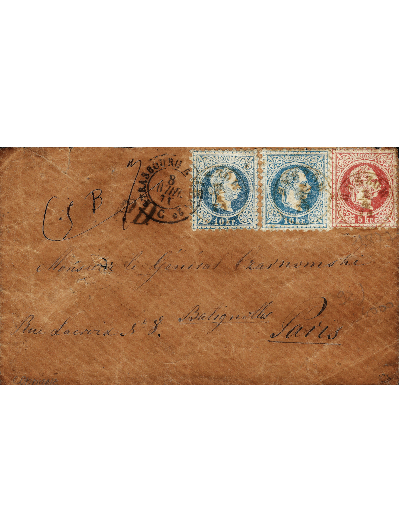 Autriche 10 kr bleu deux unités de nuances différentes et 5 kr rose type I oblitérés cachet à date de Byszow en Pologne le 4/04/71 sur enveloppe à destination de Paris. Au recto, le cachet à date des convoyeurs de Strasbourg à Paris le 8 avril 71. Au verso, les cachets de passage à Brody puis Wien. TB et très rare, signée ROUMET avec certificat.