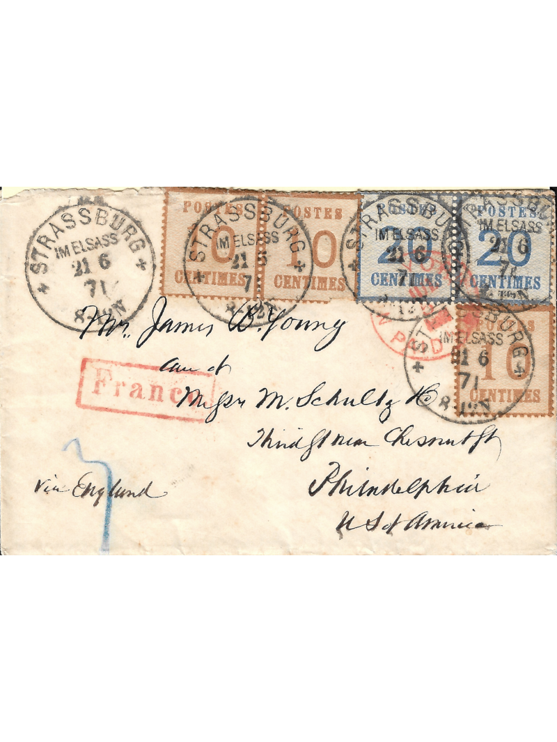 10 centimes bistre une paire plus une unité et 20 centimes bleu en paire, oblitérés par le cachet allemand simple de cercle de Strassburg im Elsass le 21/06/71 sur lettre de à destination des Etats Unis en double port. Au recto, la marque franco en rouge et le cachet de passage à Lonfres. Superbe et très rare destination. Certificat.