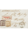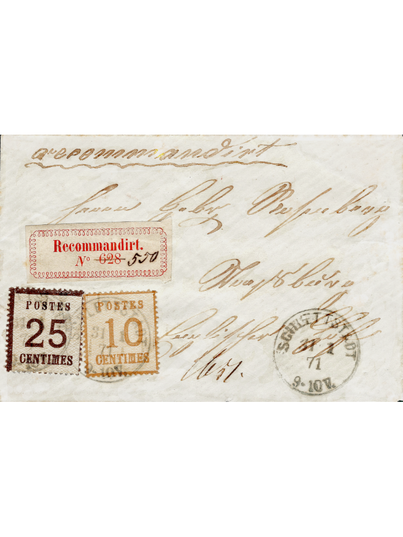 25 centimes brun et 10 centimes bistre oblitérés cachet simple cercle allemand de Schlettsstadt le 31/01/71, 3 jours après l'Armistice. Au recto, l'étiquette "recommandirt" ( 4 mois après le 1ère utilisation) lettre recommandée et répété le cachet à date sur enveloppe à destination de Strasbourg. Au verso le cachet à date d'arrivée. Superbe. Signée.