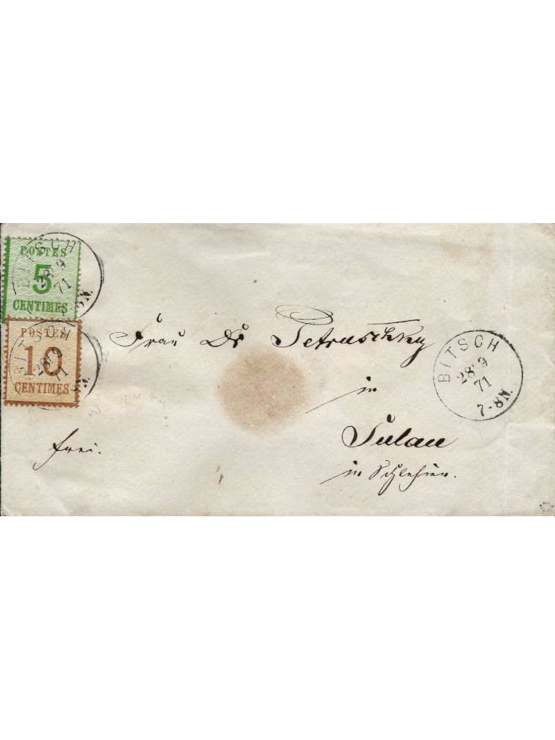 5 centimes vert et 10 centimes bistre (burelage renversé) oblitérés par le cachet allemand simple en cercle de Bitsch le 28/09/71 sur une enveloppe à destination de l'Allemagne. Au verso, le cachet à date d'arrivée et de cire. Superbe, signée Roumet avec certificat.