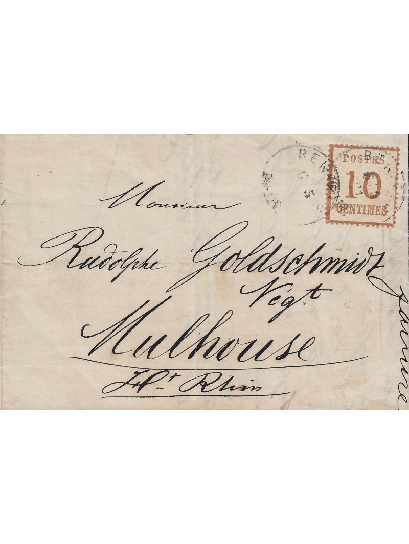 10 centimes bistre, oblitérés cachet allemand simple cercle de Benfeld le 6 mai 71 sur une lettre à destination de Mulhouse.