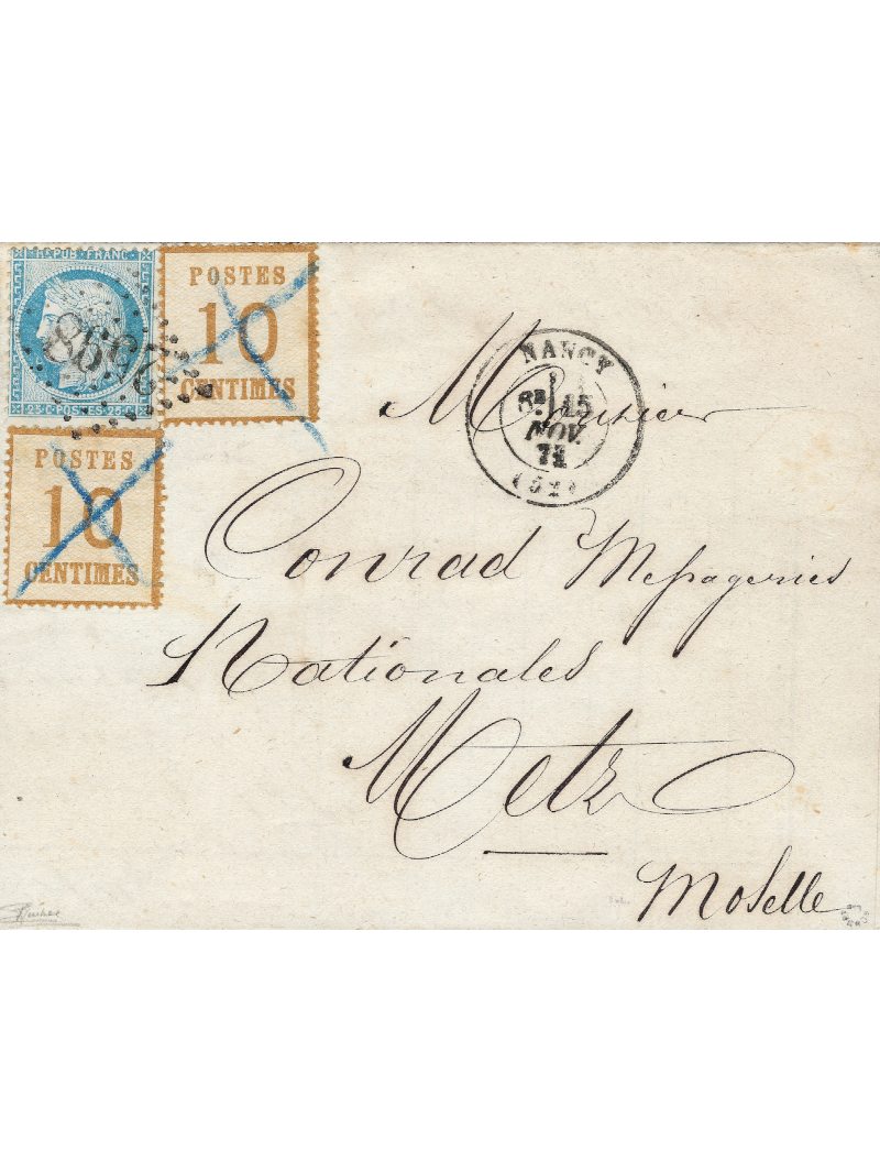 10 centimes bistre oblitérés par une croix de plume et 20 centimes bleu. Emission du siège oblitéré losange gros chiffres 2598 sur une lettre avec correspondance de Nancy à destination de Metz. Au recto, le cachet à date type 17 de Nancy le 15/11/71. Superbe, signée Roumet avec certificat.