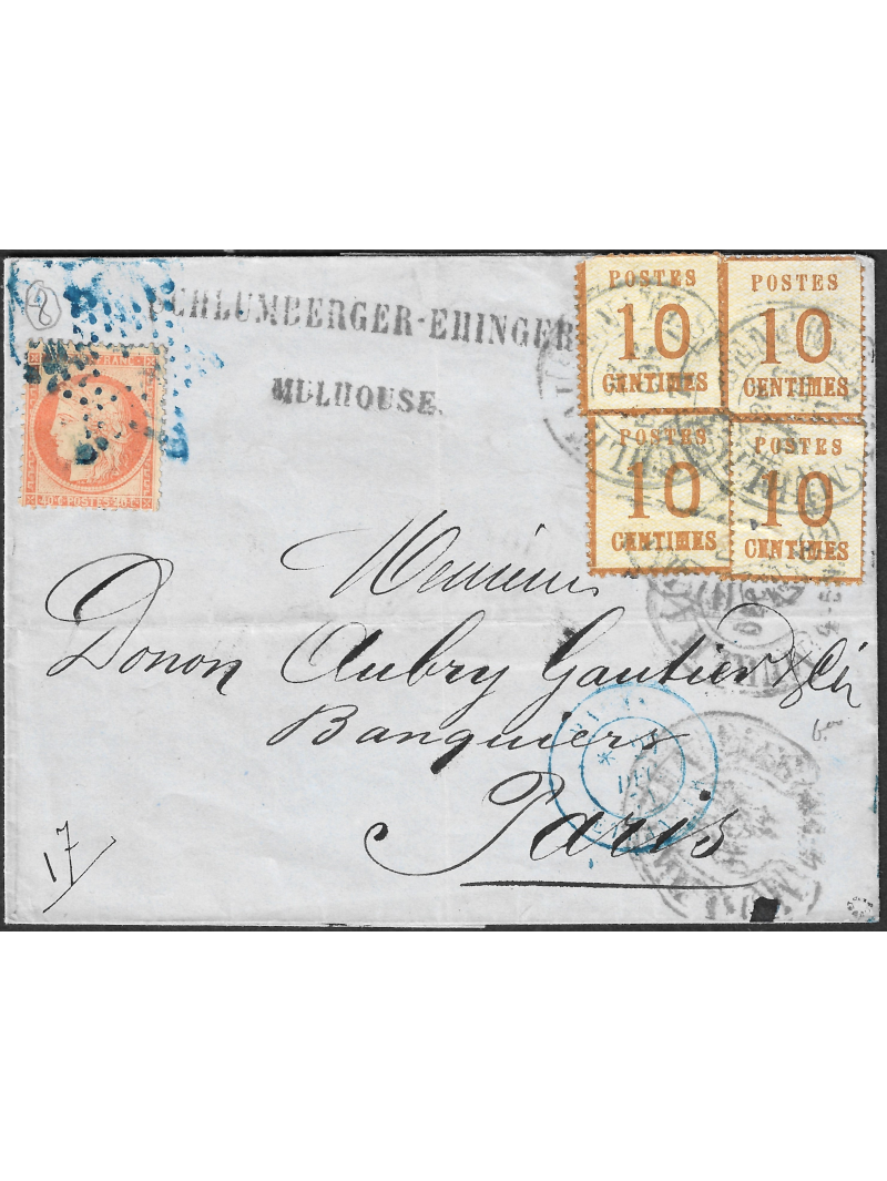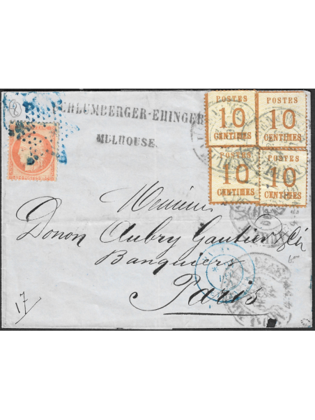 10 centimes bistre, 4 unités (dents courtes) oblitérés par le cachet allemand fer à cheval de Mulhausen le 26/12/71 et émission du siège 40 centimes orange oblitéré par l'étoile bleue sur lettre en double port à destination de Paris. Au recto, le cachet à date bleu Paris étranger du 27/12/71. Exceptionnelle combinaison. Superbe, signée ROUMET avec certificat.