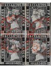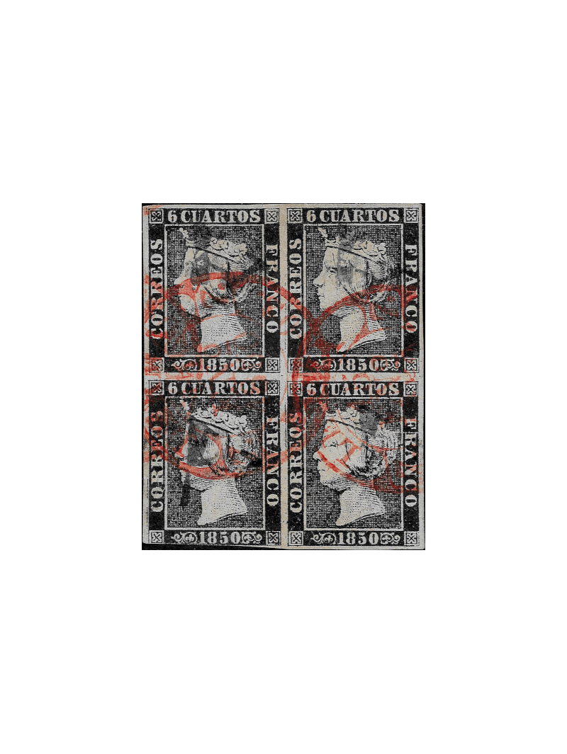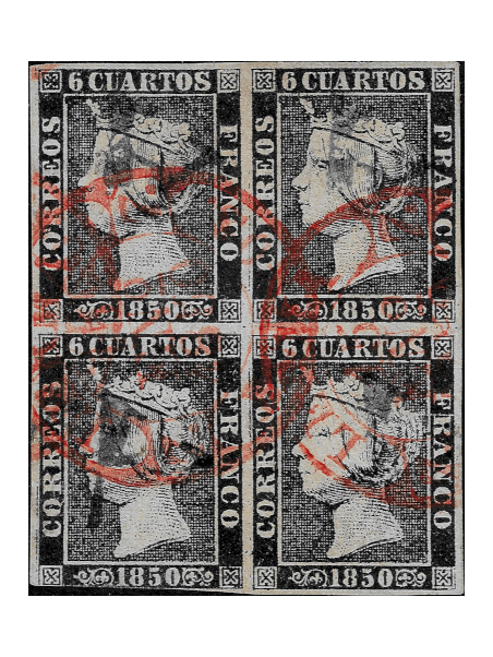 Isabelle II 6 cuartos de janvier 1850 en bloc de 4 la marge du timbre bas à gauche courte, oblitérés cachet à date rouge, et marque préphilatélique A noir de Burgos. Superbe seuls bloc 4 connus. Signé ave certificat.