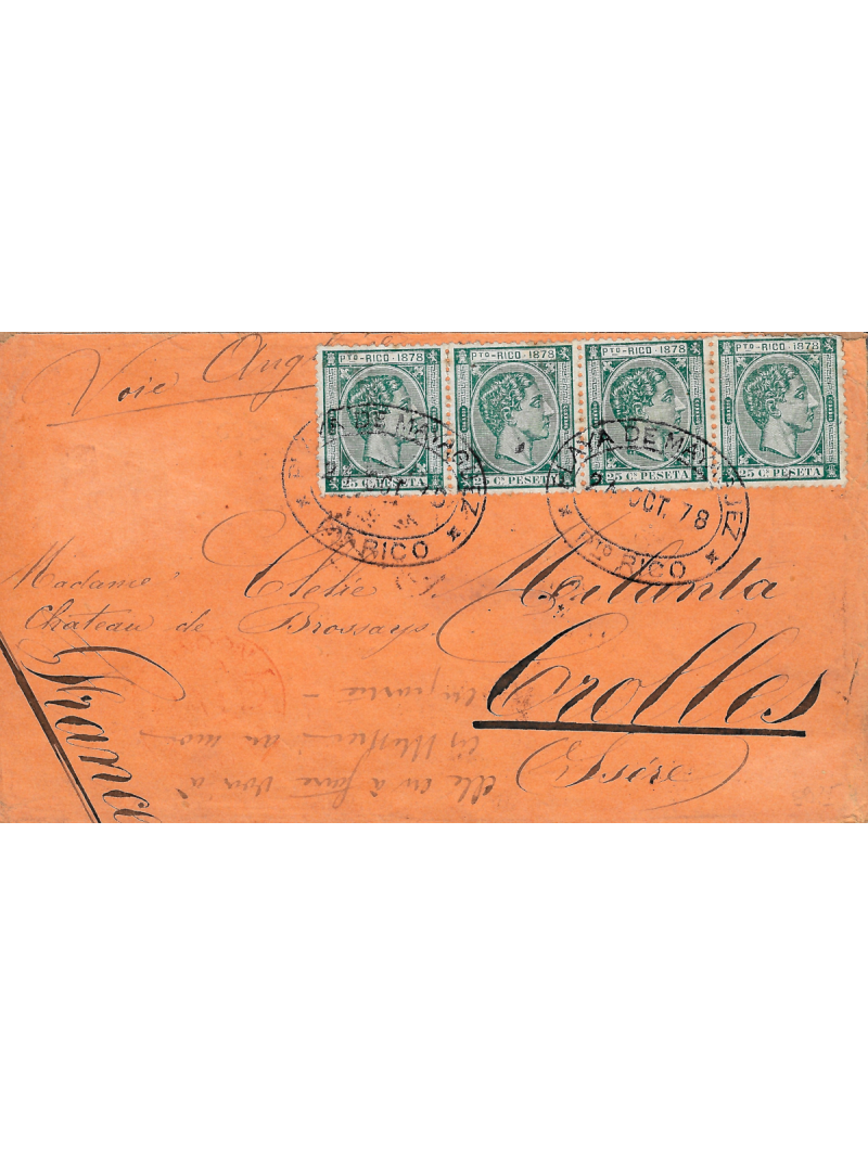 25 pesetas vert bleu dentelé 14, édition de 78 très belle bande de quatre, oblitérés par le cachet Playa de Mayaguez le 24/10/78 sur lettre pour la France. Au recto, le cachet de passage à Londres. Superbe composition.