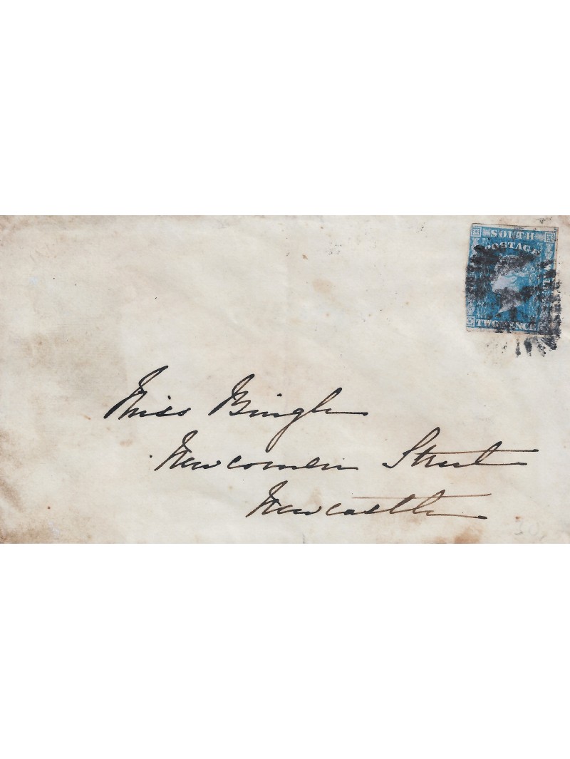 Two pence bleu foncé avec l'étoile aux angles, marge de gauche courte, sur lettre à destination de Newcastle. Au verso les cachets de passage et d'arrivée.