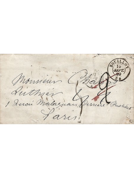 Correspondance d'un prisonnier à Sedan, du 7 septembre 70, confiée à un passeur qui l'a déposée à Bouillon en Belgique. Elle a été taxée à la plume à 2 puis à 5 décimes. Au recto, le cachet à date de Bouillon le 10 septembre 1870. Au verso, le cachet d'entrée en France le 11 septembre 1870. Superbe et très rare, avec un intérêt historique. Signée ROUMET. Certificat.
